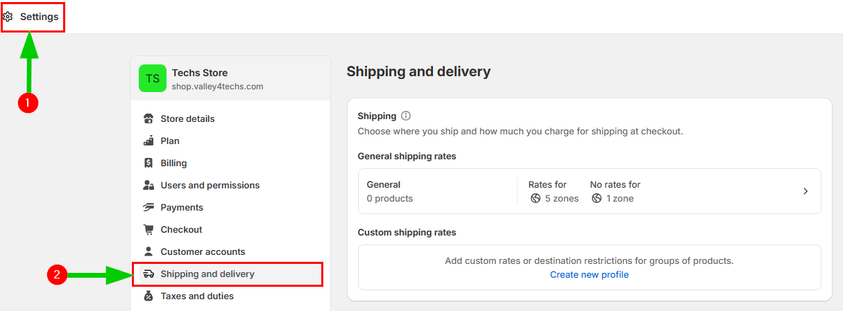 ولإعداد معدل الشحن في شوبيفاي سنذهب إلى مسؤول شوبيفاي، ثم ننقر على Settings، بعدها نضغط على Shipping and delivery. وتحت القِسم Shipping سنرى قائمة بمناطق الشحن الخاصة بنا