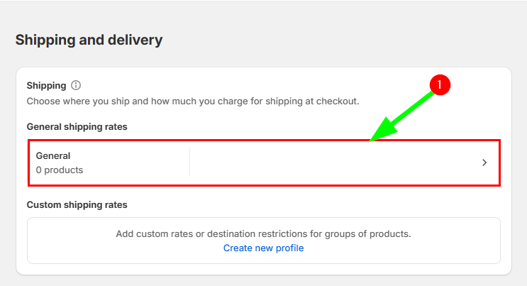 تحت القِسم Shipping سنرى قائمة بمناطق الشحن الموجودة أو منطقة الشحن الافتراضية باسم General إذا لم نُنشئ أيًا منها بعد؛ أو يمكننا إضافة منطقة شحن جديدة من خلال الضغط على Create new profile، ثم إدخال اسم لمنطقة الشحن الخاصة بنا، مثل المملكة العربية السعودية. ونظرًا إلى أننا لن نحتاج إلى إضافة منطقة شحن جديدة لأننا نغطي دولة مصر فقط، فسنستخدم المنطقة الافتراضية General.
