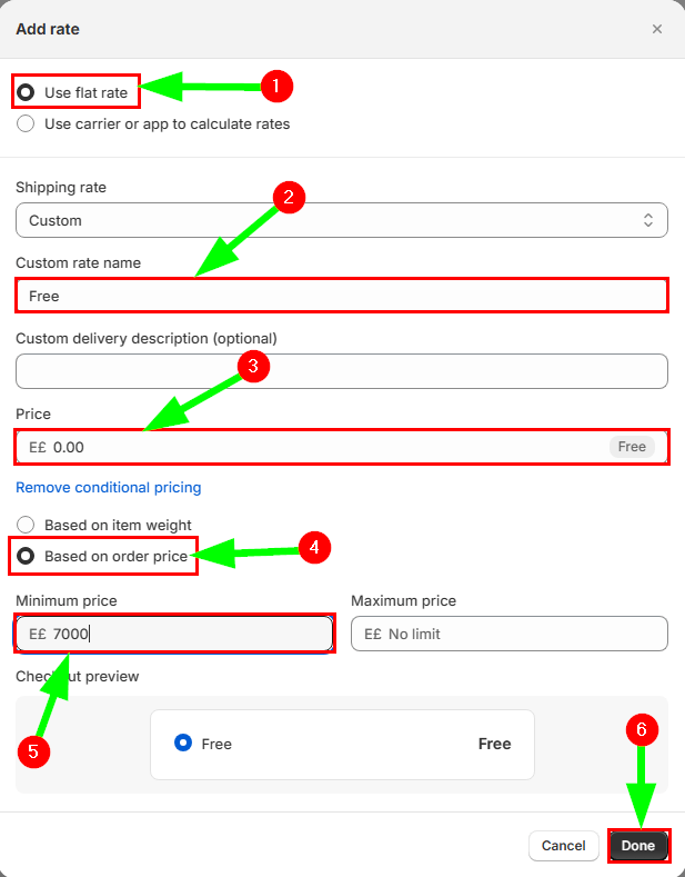 وهي الشروط التي تحدد متى ينطبق سعر الشحن، ولتكن مثلًا على أساس وزن الطلب، أو على أساس إجمالي سعر الطلب؛ وفي حالتنا حددت شرط إذا كان إجمالي سعر الطلب 7000 جنيه يكون الشحن مجاني