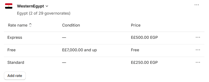 ولإضافة سعر الشحن إلى منطقة الشحن، ننقر فوق اسم منطقة الشحن، مثل غرب مصر التي أنشأناها للتو، ثم ننقر على الزر Add rate.