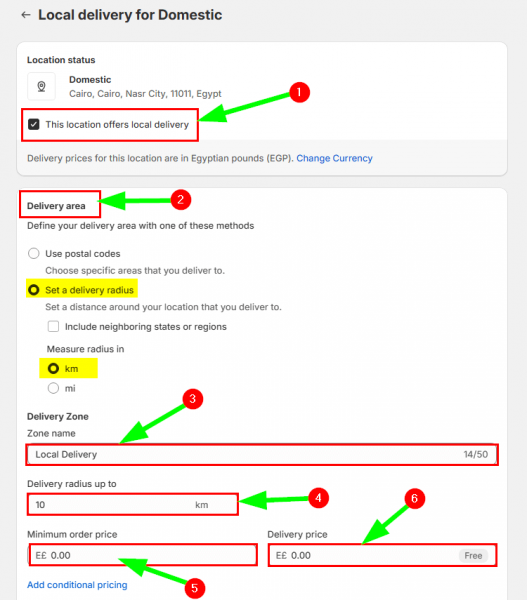 سنحدد الآن خيار This location offers local delivery حتى تظهر لنا إعدادات هذا الخيار؛ ومن القِسم Delivery area، سنحدد ما إذا كنا نريد تقديم خدمة التوصيل ضمن مسافة محددة من الموقع، أو لرموز بريدية معينة، ثم نكتب اسمًا لخدمة التوصيل المحلية، لنحدد بعد ذلك الحد الأدنى لإجمالي سعر الطلب وسعر التوصيل.