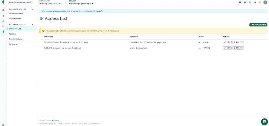 استخدمت IP عالمي في mongodb atlas لكن مر وقت حوالي نصف ساعة وهي قيد الانتظار Pending ما سبب وكيف يمكن حلها