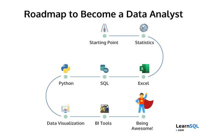 الدورة ليس تخصصها مجال تحليل البيانات، ما ستتعلمه بها هو جزء كبير من الأساسيات اللازمة لذلك المجال، بعد ذلك ستحتاج تعلم أساسيات برنامج الـ Excel، وبالأخص دوال ومعادلات SUM, AVERAGE, VLOOKUP, INDEX, و MATCH. ثم دورة لتعلم الإحصاء والإحتمالات، سواء من Khan Academy أو من مصادر أخرى، ثم دورة أخرى متخصصة في تحليل البيانات باستخدام برنامج الـ Excel. ثم تعلم قواعد البيانات ولغة الـ SQL وقد تعلمت ذلك بالدورة بالفعل، لكن ستحتاج إلى تعلم SQL for Data Analytics للتعمق قليلاً والتعرف على مفاهيم متقدمة منها JOINs بأنواعها، GROUP BY, Window Functions, Subqueries, CTEs، وللعلم معظم مقابلات العمل لمحللي البيانات تتضمن أسئلة SQL متقدمة. الخطوة التالية هي تعلم أحد برامج التحليل والتصوير المرئي للبيانات مثل Power BI أو Tableau أو Google Looker Studio، وبالطبع الأفضل برنامج Power BI فهو المطلوب في سوق العمل. كما أنه يجب عليكِ الاستمرار في التطبيق بكثافة على بيانات حقيقية لتحليلها كلما تقدمت في المسار التعليمي، ومن أشهر المواقع التي يمكنك الحصول منها على بيانات لتقم بتحليلها هو موقع Kaggle الشهير، ولديك أيضًا Data.gov. للتبسيط الصورة التالية جيدة: وفي المرحلة المتقدمة ستحتاج إلى دراسة تعلم الآلة، وذلك ما ستتعلمه بالدورة بالفعل، بالتالي تحتاج إلى دراسة القليل خارج الدورة فيما يخص الأساسيات. ستجد هنا تفصيل لما تحتاجه: https://roadmap.sh/data-analyst