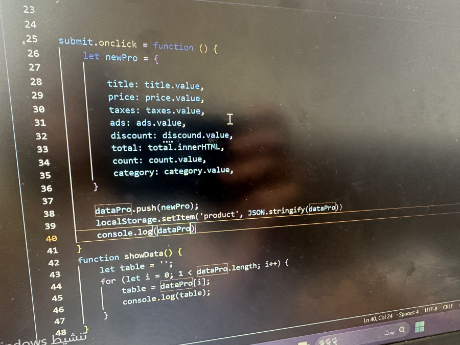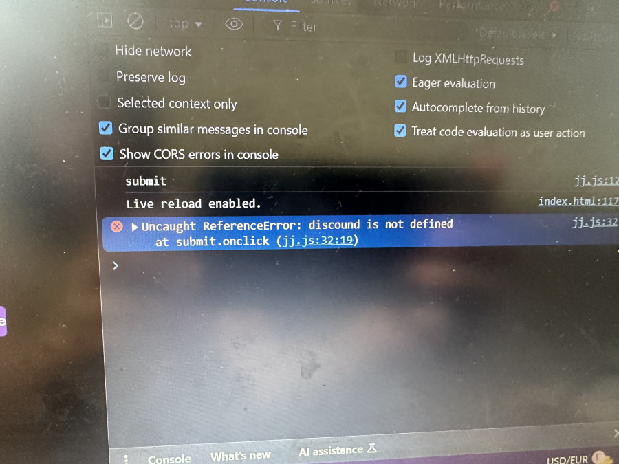 عند مراجعة الكود، يمكن ملاحظة أكثر من سبب محتمل للخطأ الظاهر لديك، وسنحاول توضيحها. أولًا، رسالة الخطأ توضح أن المتغير discound غير معرّف. هل يمكنك ملاحظة أن اسم المتغير الذي عرّفته في الأعلى هو discount بدون حرف o إضافي، بينما داخل الكائن كتبت discound.value، وهذا الاختلاف في الاسم يؤدي إلى هذا الخطأ. ننصح بمحاولة توحيد أسماء المتغيرات حرفيًا دون أي اختلاف. ثانيًا، حاول أن تتحقق من سطر تعريف ads، حيث لم يتم وضع علامة =، مما سيؤدي إلى خطأ نحوي لاحقًا. كذلك، من المفيد مراجعة شرط الحلقة for لأنك استخدمت الرقم 1 بدل المتغير i في الشرط. قم بتجربة تشغيل الكود بعد تصحيح كل خطأ على حدة، ومتابعة رسائل وحدة التحكم (Console)، لفهم مصدر المشكلة وطريقة حلها. شكرًا لك