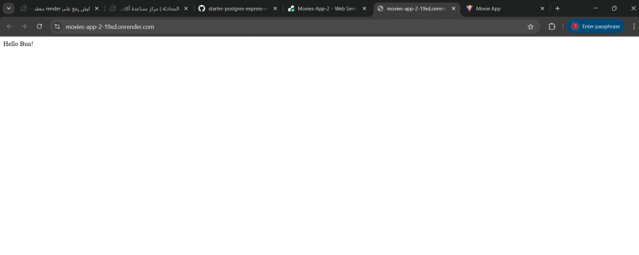 أرسل صورة للرد الذي يظهر لك عند إرسال طلب Get إلى رابط الخادم على الاستضافة من المفترض أن تحصل على: Hello Bun!