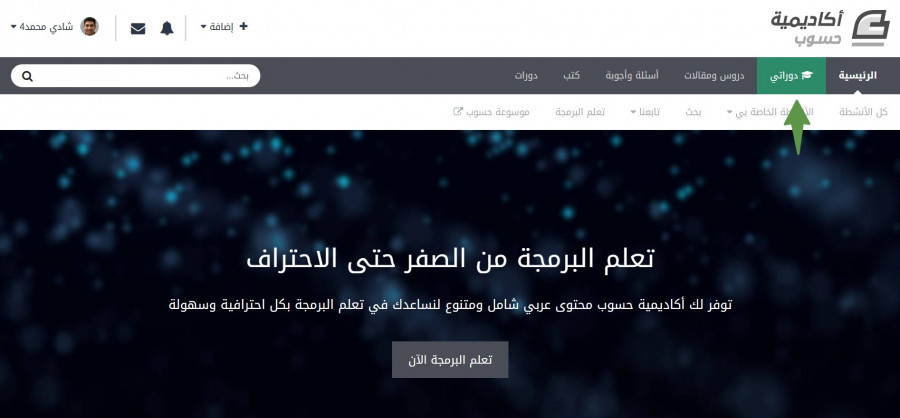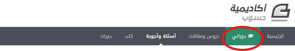 هل تظهر علامة دوراتي كما بالصوره التاليه ؟ إذا كانت تظهر لك فيرجى الضغط عليها والإنتقال للدورة التي إشتركت بها أما إذا لم تظهر كلمة دوراتي فيرجى الإنتظار قليلاً فأحيانا الأمر يستغرق بعض الوقت لمعالجة عملية شراء الدورة، وسيظهر لكِ بعدها تبويب دوراتي واذا لم يظهر يرجى المتابعة مع مركز المساعدة من خلال الرابط التالي https://support.academy.hsoub.com/conversations