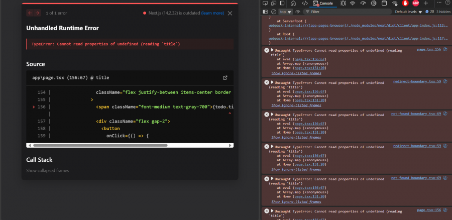 المشكلة في ملف app\api\todos\route.ts حيث تقوم بإعادة البيانات كما هي ولكنك في الواجهة الأمامية تستقبلها من todo.todos ولهذا تحدث المشكلة . لذلك يجب إعادة البيانات بداخل كائن json لديه todos . في سطر 20 و 49 يجب ان يكونا كالتالي : return NextResponse.json({todos}, {status:200}); return NextResponse.json({todo}, {status:201}); وهذا هو الملف . route.ts