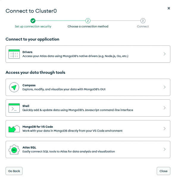 بما أنك توقفت عند هذه الخطوة فيمكنك إختيار الطريقة التي تريدها مثل driver أو compass مثلاً . وبعدها يمكنك استخدام الرابط الذي يظهر لك للإتصال بقاعدة البيانات ويمكنك الإطلاع على المقالة التالية للمزيد من التفاصيل حول الخطوات الواجب تنفيذها