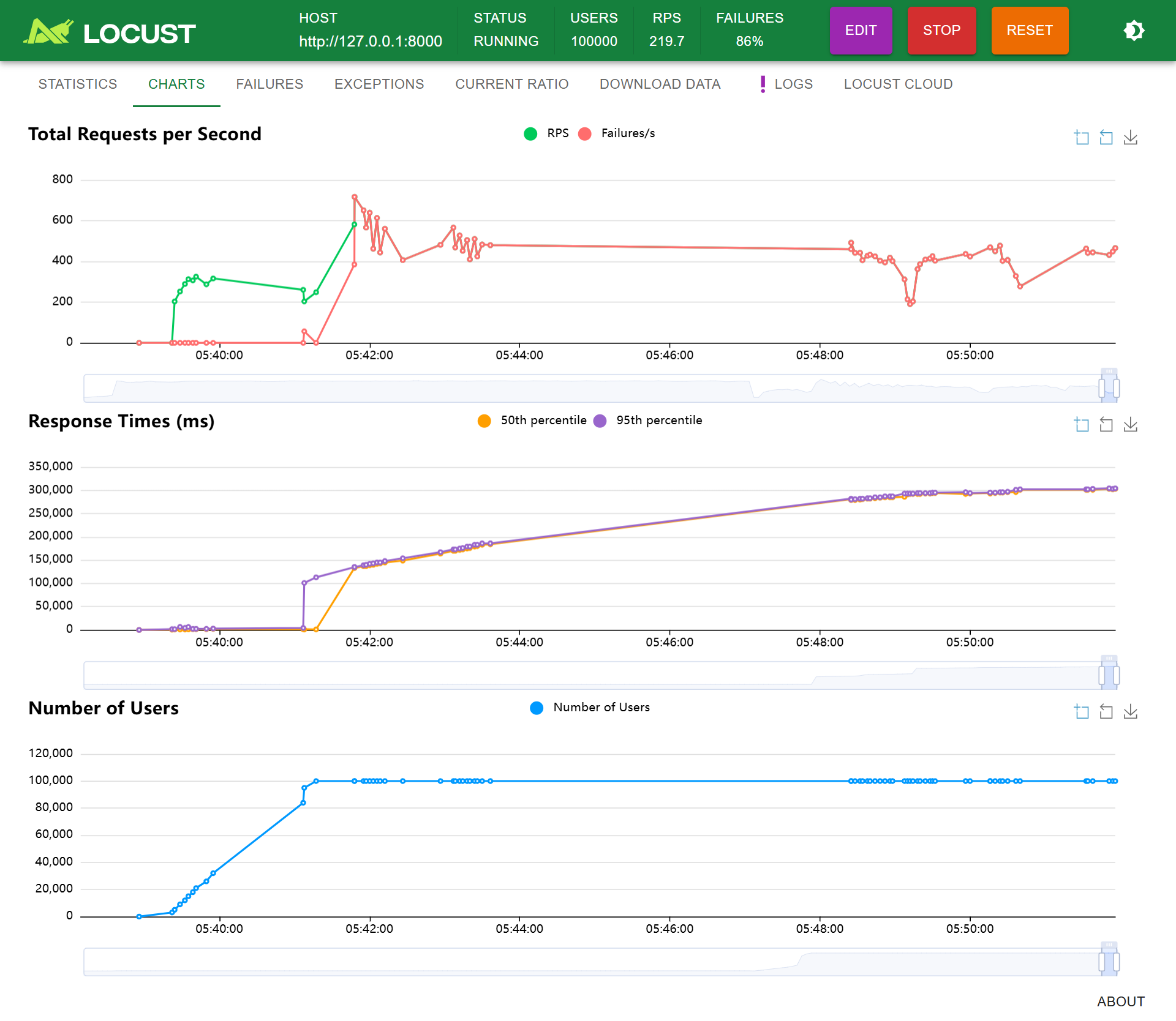 وصلت نسبة الفشل إلى 88% حيث فشل 332008 طلب من أصل 377561، وكان متوسط سرعة الإجابة 174 ثانية، وهذا وقت طويل يدل أن النظام لم يستطع تحمل الزيادة في الحمل، كما نرى من الرسومات البيانية الموضحة بالأعلى أن النظام بدأ في التدهور عندما تجاوز عدد المستخدمين 50 ألف تقريبًا، هذه المعلومات تمكننا من تحسين كفاءة النظام تحت الضغط بإجراءات مثل تحجيم عدد الطلبات المسموح للمستخدم إرسالها في فترة زمنية محددة، واستخدام رتل Queue لتخزين الطلبات الفائضة عن سعة النظام لتعالج عندما يستطيع النظام استيعاب المزيد من الطلبات، فبدلًا من محاولة معالجة 100 ألف طلب نستطيع تخزين الطلبات في رتل Queue وندفع الطلبات للنظام على هيئة دفعات كل دفعة تتكون من 10000 طلب فقط.