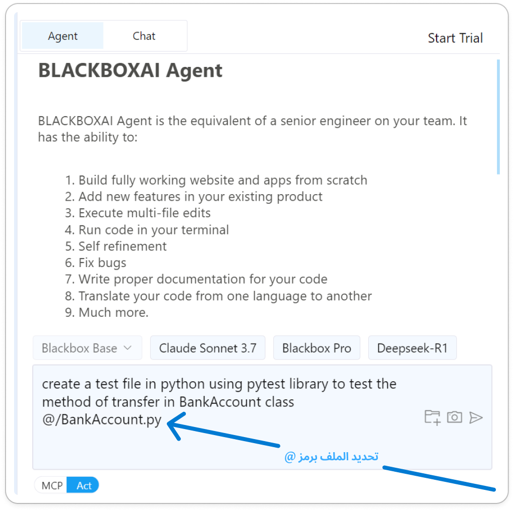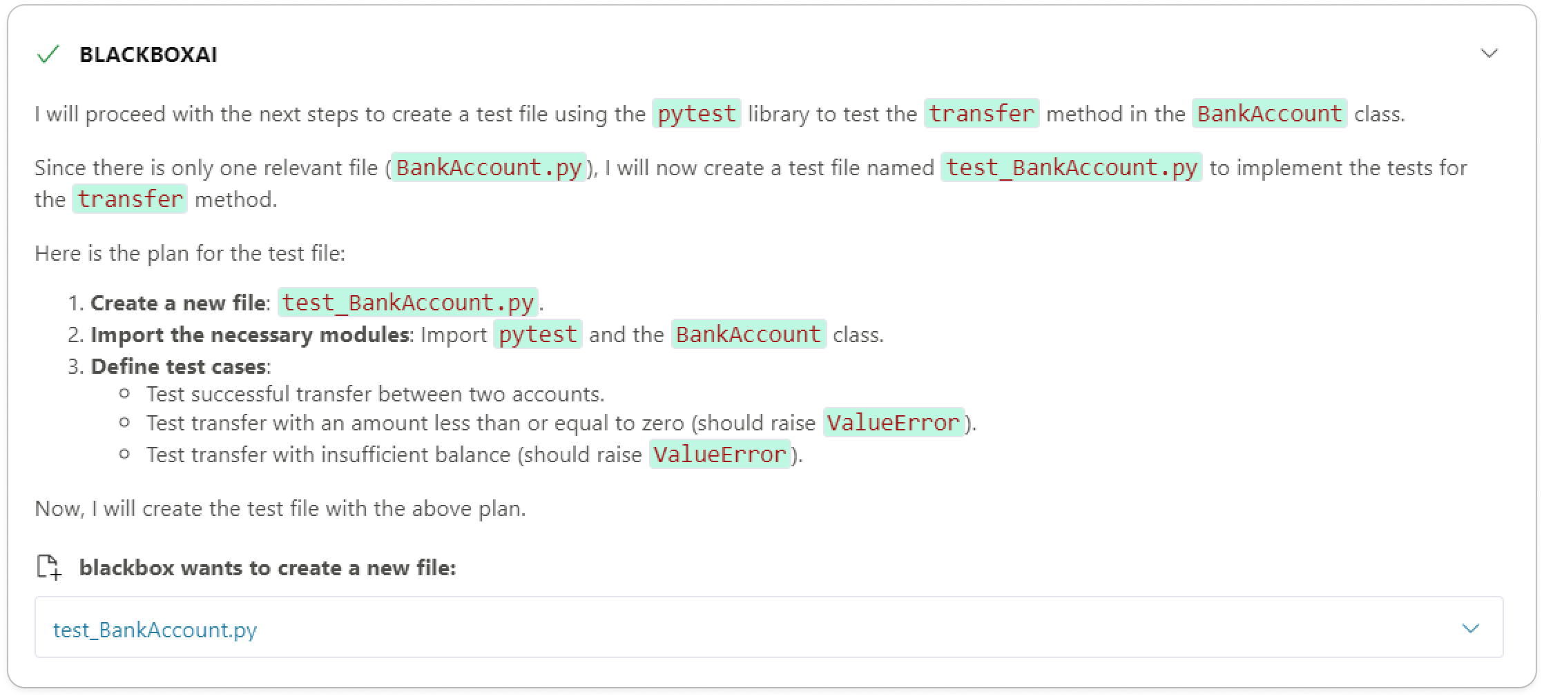 نختبر الآن دالة تحويل الأموال في معزل عن باقي النظام باستخدام أداة BlackBox AI، من خلال توليد حالات اختبار مناسبة باستخدام مكتبة pytest لأنها من أبسط المكتبات المتاحة في لغة بايثون لتنفيذ اختبار على مستوى الوحدة، وبما أننا ثبتنا إضافة BlackBox AI في محرر Vscode فستكون موجودة في القائمة الجانبية في يسار المحرر، ونخبرها أن تنشئ ملف اختبار لوظيفة تحويل الأموال بين الحسابات البنكية كما يلي:
