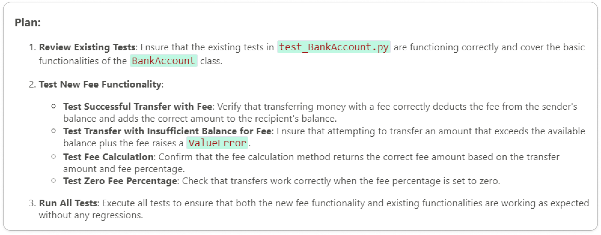 لذا سنطلب من BlackBoxAI أن يغطي نطاقًا أوسع من حالات الاستخدام مع التركيز على الحالات المتطرفة لضمان استقرار النظام، كما يمكن مناقشته كذلك في حالات اختبار أخرى من من فهمنا لاحتياج النشاط التجاري -البنك في حالتنا- ومراجعة النتائج التي تعود بها علينا للتأكد من مناسبتها لحالة الاستخدام لدينا فلن تعطل وظيفة عاملة بالفعل، فالأداة عرضة للخطأ مهما بلغت من براعة. على سبيل المثال، نريد التأكد من قدرة النظام على التعامل مع الأخطاء غير المتوقعة، مثل فشل عملية تحويل الأموال لأي سبب: