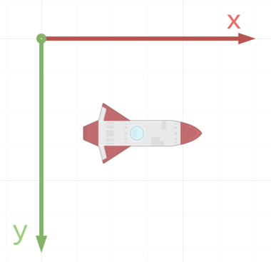 تشير السفينة هنا إلى نفس اتجاه المحور X، فلو أردنا منها التحرك نحو اﻷمام، نضيف مقدار الحركة إلى الإحداثي اﻷفقي X فتتحرك نحو اليمين: