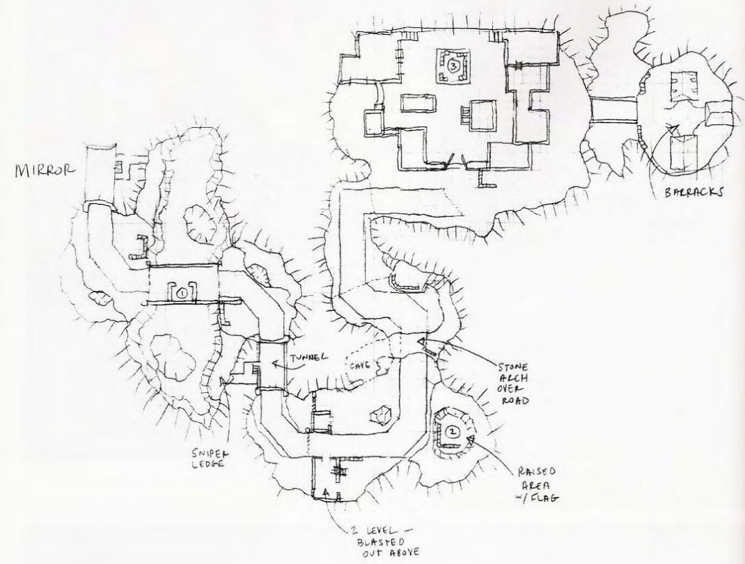 صورة توضح رسمًا لخريطة Warpath متعددة اللاعبين في لعبة Team Fortress Classic، من رسم المصمم روبن ووكر Robin Walker.