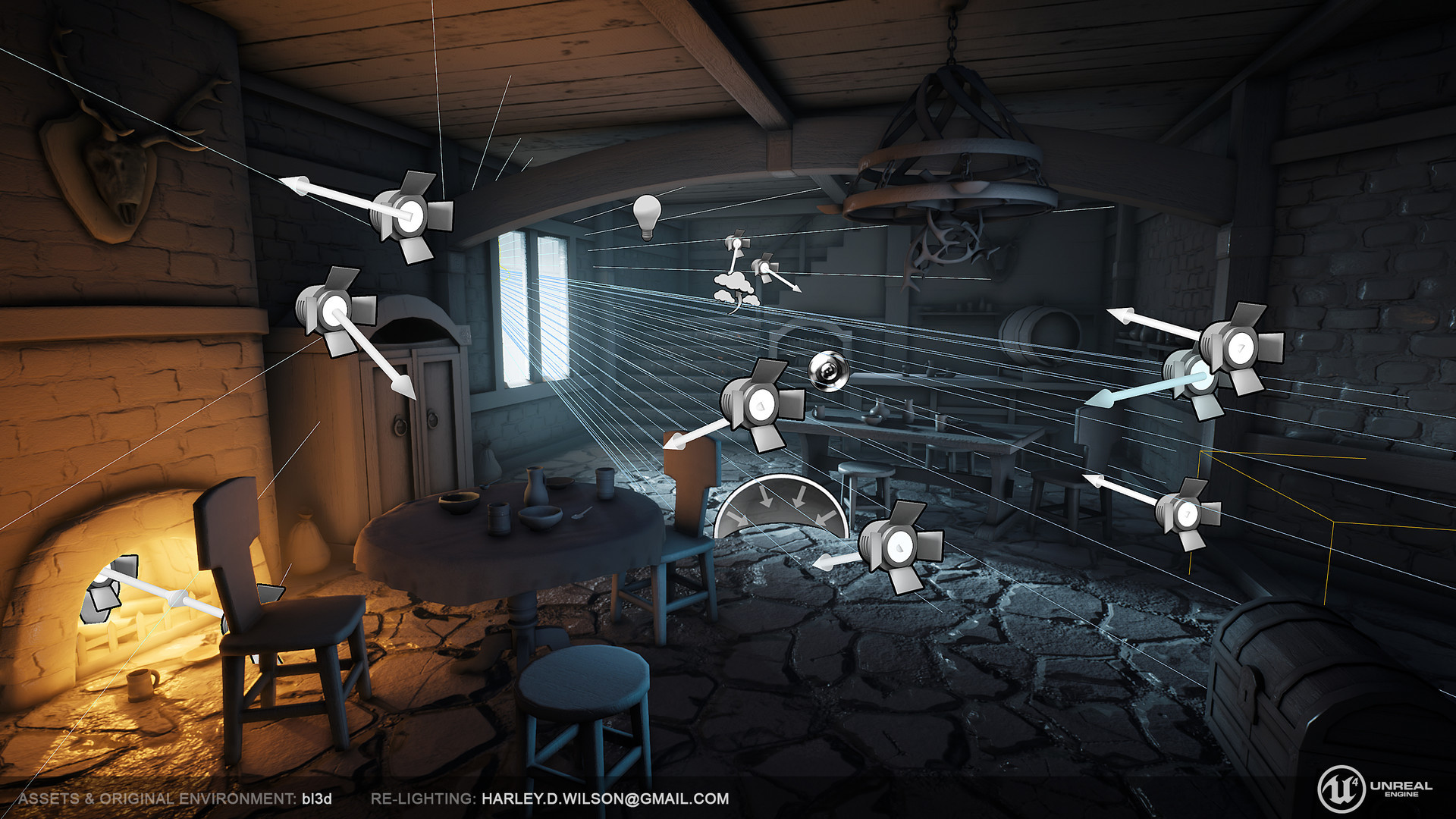 صورة لإضاءة غرفة من العصور الوسطى نفذها هارلي ويلسون Harley Wilson توضح توزيع الإضاءة في المشهد.