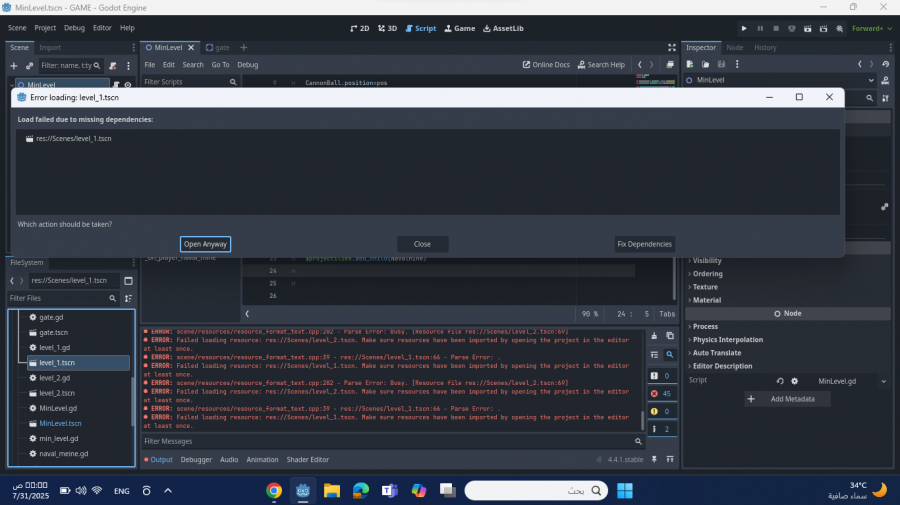 سلطان مهنا نشر 30 يوليو 2025 أرسل تقرير نشر 30 يوليو 2025 تحيه طيبه عملت مشهد يوم امس و حفظته عندما محاولت فتحه تظهر رسالة خطاء المرفقه في الصوره الرجاء المساعده في حل المشكله شكرا ومقدر كذالك ارفقت الملف الذي فيه المشكله level_1.tscn 1 اقتباس