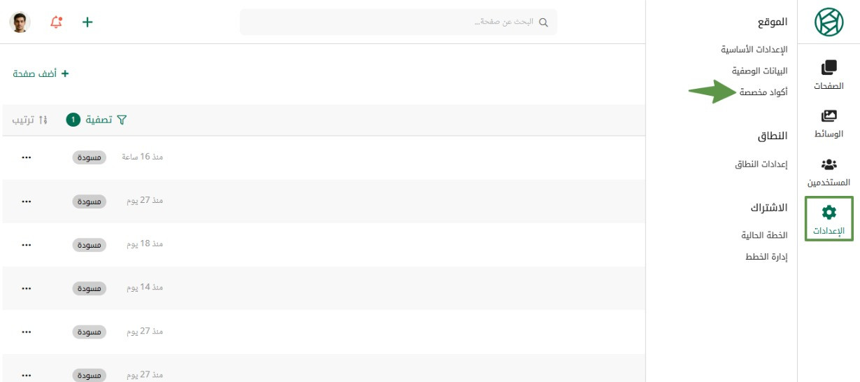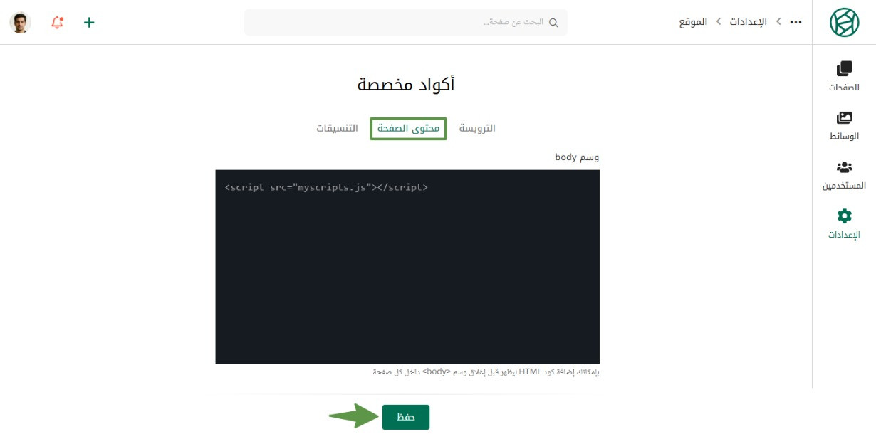 0 Mustafa Suleiman نشر 11 مارس أرسل تقرير نشر 11 مارس الواجهة الأمامية للمنصة تم تطويرها من خلال React بالفعل، لكن التخصيص من قبلك لا يتم بواسطة كود JSX الخاص بـ React، بل من خلال لغات الويب HTML, CSS, JS فهي اللغات التي يستوعبها المتصفح والتي يتم تحويل كود JSX إليها. يمكنك إضافة أكواد HTML ,CSS و JavaScript مخصصة في جميع صفحات موقعك كالتالي: في رئيسية سنديان، اضغط على لوحة التحكم في شريط القوائم العلوي. ثم الضغط على الموقع الخاص بك للوصول إلى الإعدادات الأساسية. ثم من القائمة الجانبية بلوحة التحكم، اضغط على الإعدادات ثم اختر أكواد مخصصة. إضافة كود إلى وسم Head بإضافة كود HTML في الترويسة، ليظهر قبل إغلاق وسم <head> داخل كل صفحة من صفحات موقعك. إضافة كود إلى وسم Body ليظهر قبل إغلاق وسم <body> داخل كل صفحة من صفحات موقعك. اقتباس